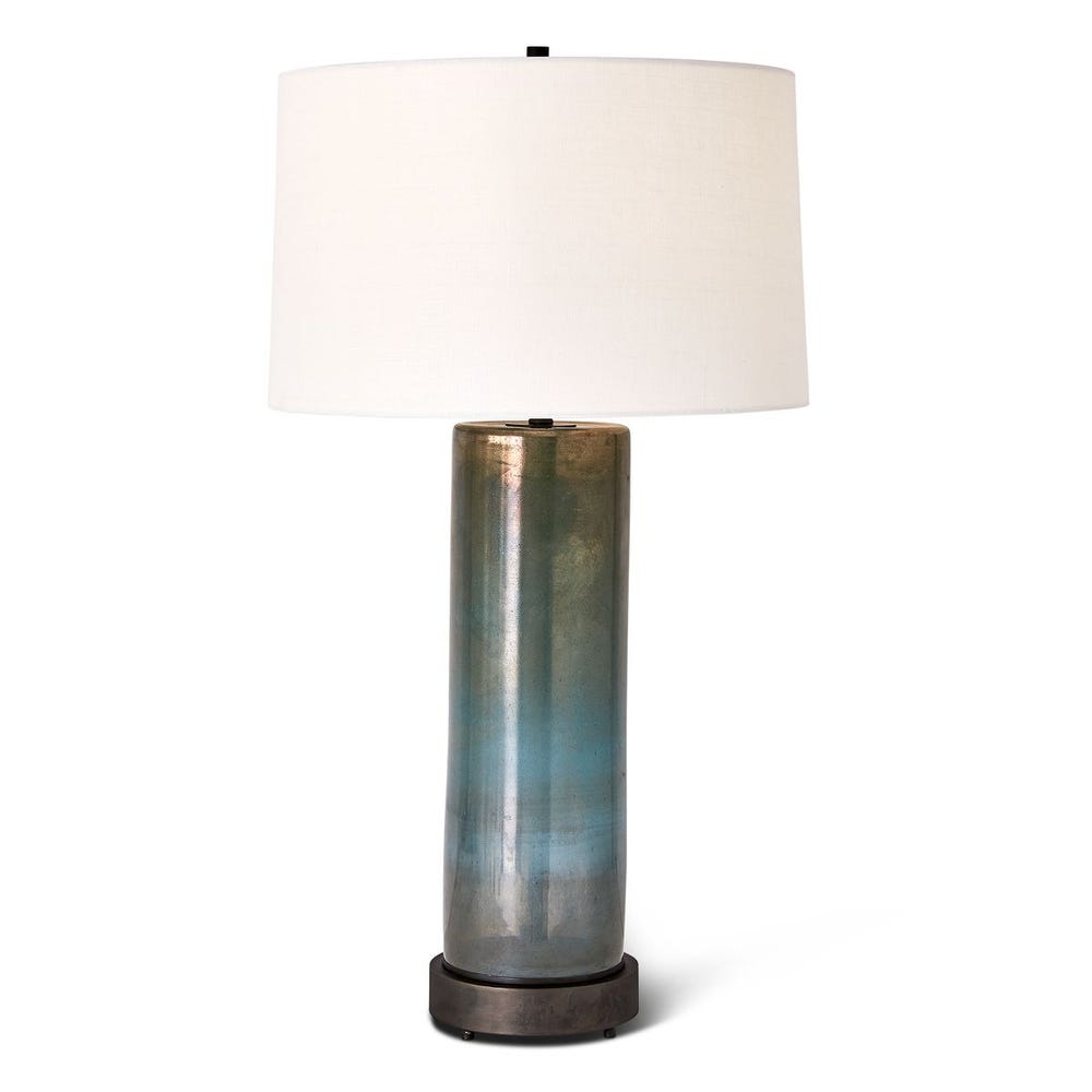 Invite luminous artistry into your décor with this aqua & midnight hand-blown glass table lamp. The base is formed from a column of hand-blown glass, infused with seed-like bubbles and swirling shades of ocean, aqua, and midnight, creating depth and visual texture. This elegant glass column sits atop a metal base finished in acid-oxidized dark bronze, while four integrated feet discreetly guide and conceal the power cord. The lamp is completed with a tapered round hardback shade, topped by a bronze cylindrical finial, offering soft, ambient illumination.