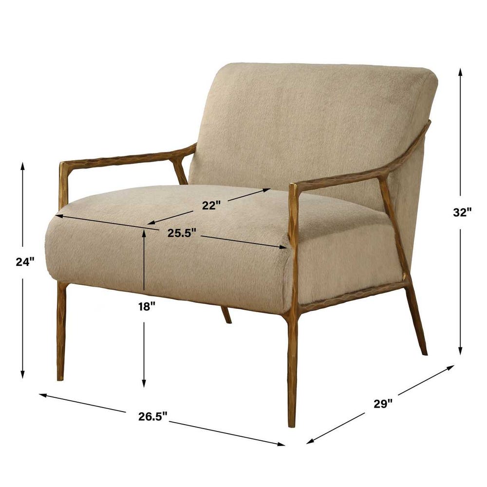 Bring luxury and comfort to your home with the Cashmere Luxe Gold Faux-Fur Accent Chair, a statement piece perfect for living rooms, bedrooms, or boutique-style lounges. Its hand-forged chiseled iron frame with an aged gold finish provides durable, high-end construction, while the plush fawn-toned faux-fur seat invites you to sink in and relax.