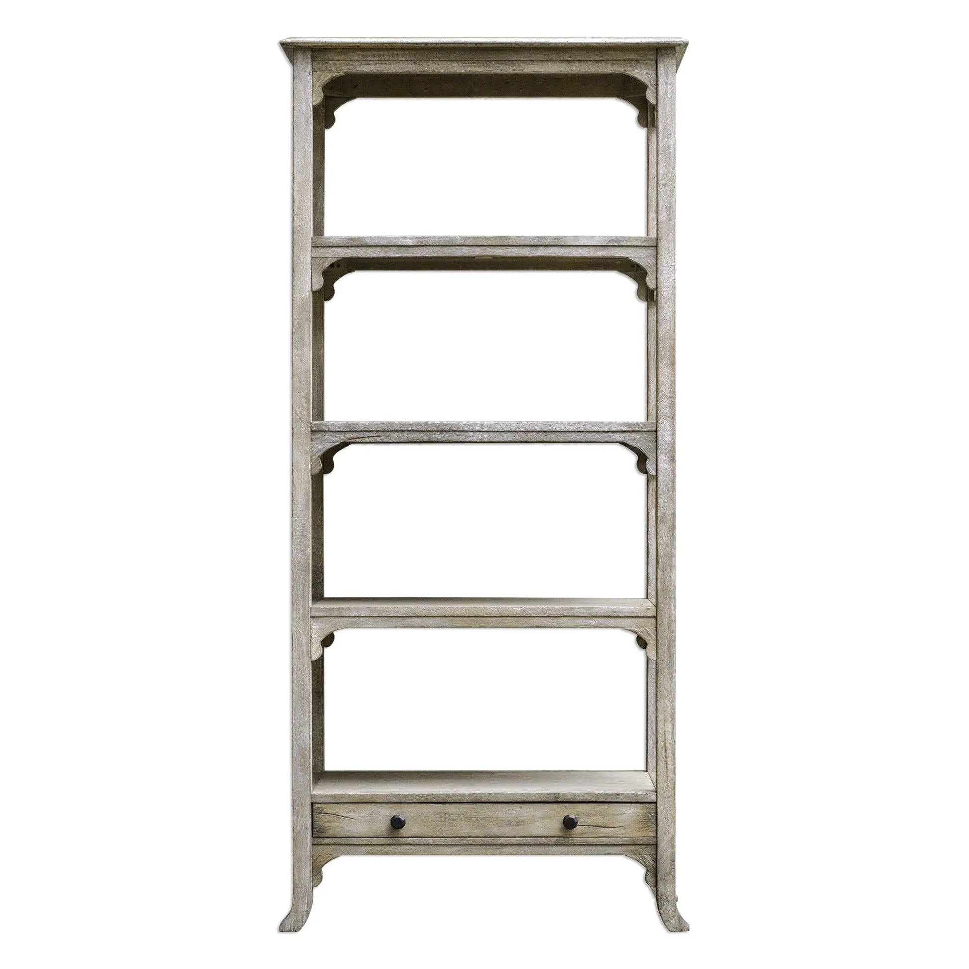 Plantation-grown mango wood makes up the solid, carved and dovetail construction with deep-grained mindi veneer in an aged white finish with antique brass drawer pulls.